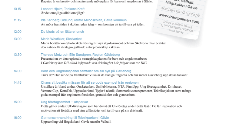 Den 17 maj arrangeras en mässa och inspirationsdag om Gävleborgs framtid. Arrangörer är Region Gävleborg, Trampolinen, Drivhuset i Gävleborg, Movexum, Högskolan i Gävle, Ungföretagsamhet och Teknikparken i Gävle. Under dagen står ungas drivkraft, kreativitet och entreprenörskap i fokus och du kommer att få lyssna till människor som på olika sätt arbetar med unga människors utveckling och vår regions framtid. Våra utställare kommer dessutom att ge dig smakprov på vilka verktyg och metoder som finns för att att stimulera och träna entreprenörskap och innovativt tänkande hos barn och ungdomar och hur man kan göra för att öka intresset för naturvetenskap och teknik.