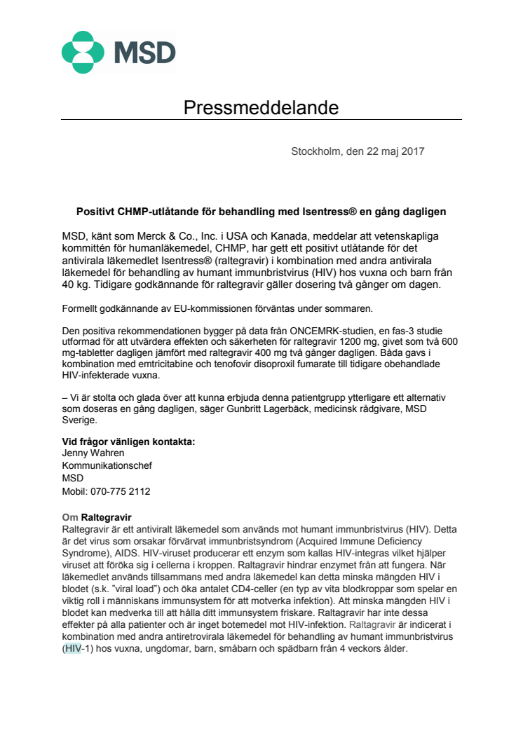 MSD, känt som Merck & Co., Inc. i USA och Kanada, meddelar att vetenskapliga kommittén för humanläkemedel, CHMP, har gett ett positivt utlåtande för det antivirala läkemedlet Isentress® (raltegravir) i kombination med andra antivirala läkemedel för behandling av humant immunbristvirus (HIV) hos vuxna och barn från 40 kg. Tidigare godkännande för raltegravir gäller dosering två gånger om dagen.