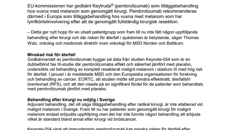 EU-kommissionen har godkänt Keytruda® (pembrolizumab) som tilläggsbehandling hos vuxna med melanom som genomgått kirurgi. Pembrolizumab rekommenderas därmed i Europa som tilläggsbehandling hos vuxna med melanom som har lymfkörtelinvolvering efter att de genomgått fullständig kirurgisk resektion.