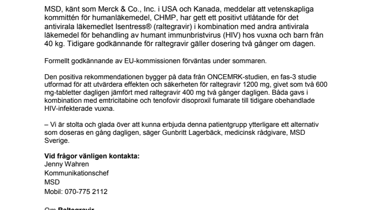MSD, känt som Merck & Co., Inc. i USA och Kanada, meddelar att vetenskapliga kommittén för humanläkemedel, CHMP, har gett ett positivt utlåtande för det antivirala läkemedlet Isentress® (raltegravir) i kombination med andra antivirala läkemedel för behandling av humant immunbristvirus (HIV) hos vuxna och barn från 40 kg. Tidigare godkännande för raltegravir gäller dosering två gånger om dagen.