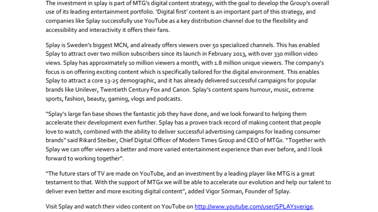 “The future stars of TV are made on YouTube, and an investment by a leading player like MTG is a great testament to that. With the support of MTGx we will be able to accelerate our evolution and help our talent to deliver even better and more exciting digital content”, added Vigor Sörman, Founder of Splay.