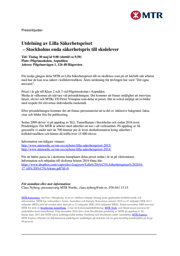 Pressinbjudan - Prisutdelning Lilla säkerhetspriset 2017