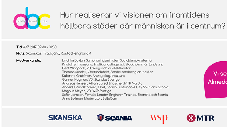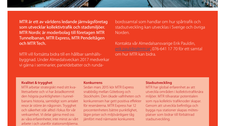 Även i år är MTR i Almedalen för att delta i seminarier och rundabordssamtal. I år fokuserar vi på kollektivtrafik, konkurrens, trygghet, inkluderande arbetsmarknad och hållbar samhällsbyggnad - både i Sverige och övriga Norden.