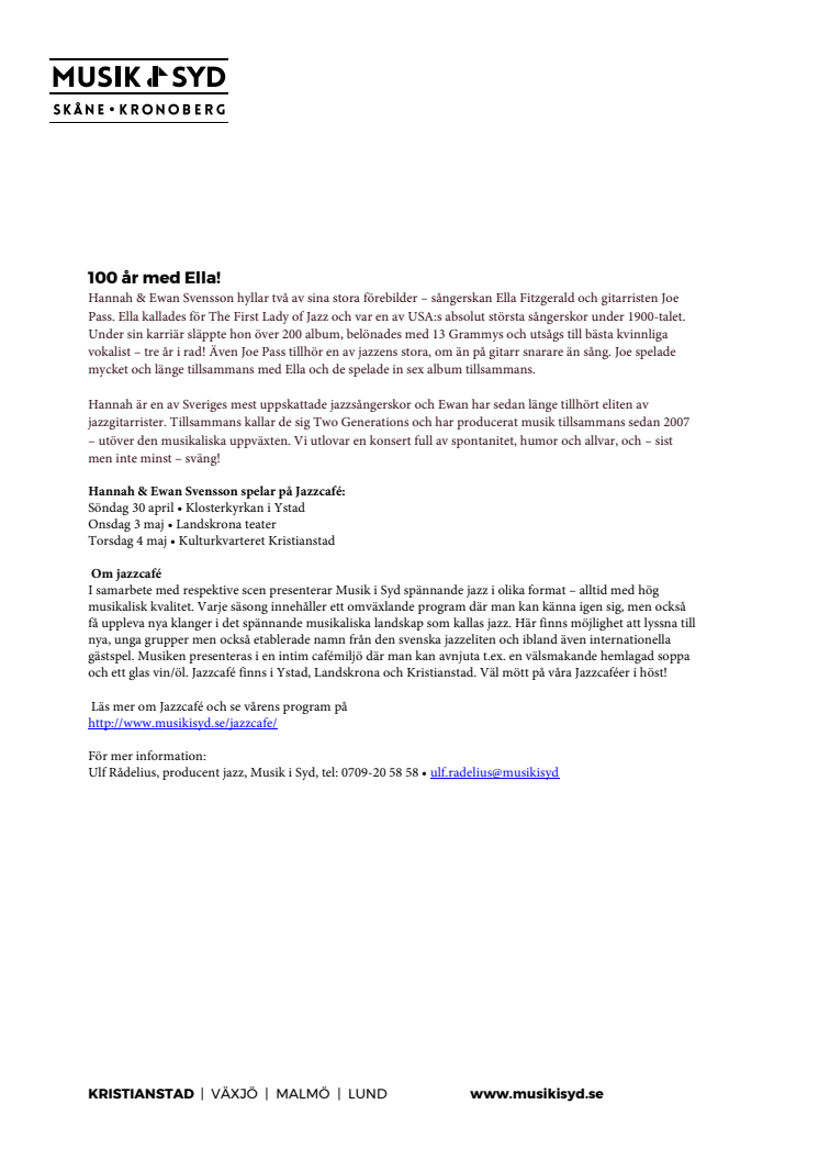 Hannah & Ewan Svensson hyllar två av sina stora förebilder – sångerskan Ella Fitzgerald och gitarristen Joe Pass. Ella kallades för The First Lady of Jazz och var en av USA:s absolut största sångerskor under 1900-talet. Under sin karriär släppte hon över 200 album, belönades med 13 Grammys och utsågs till bästa kvinnliga vokalist – tre år i rad!