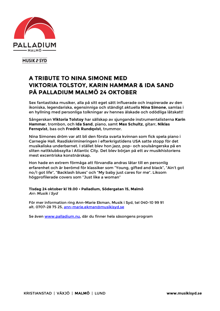 A Tribute to Nina Simone med Viktoria Tolstoy, Karin Hammar & Ida Sand på Palladium Malmö 24 oktober