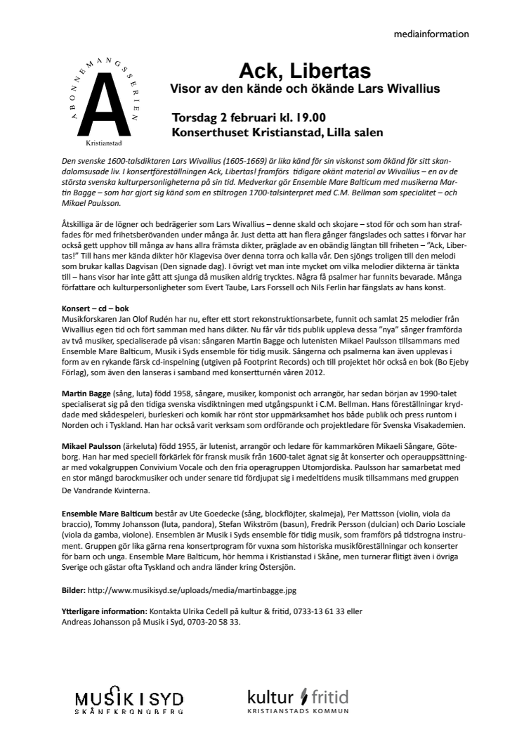 Den svenske 1600-talsdiktaren Lars Wivallius (1605-1669) är lika känd för sin viskonst som ökänd för sitt skandalomsusade liv. I konsertföreställningen Ack, Libertas! framförs tidigare okänt material av Wivallius – en av de största svenska kulturpersonligheterna på sin tid. Medverkar gör Ensemble Mare Balticum med musikerna Martin Bagge och Mikael Paulsson.