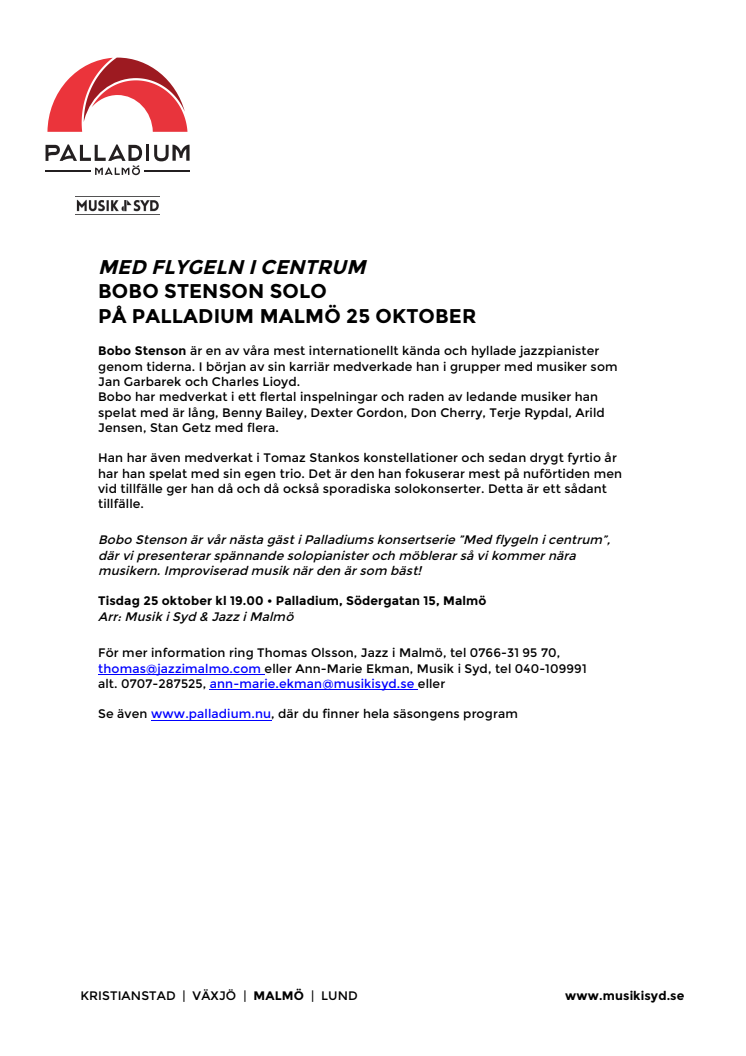 Bobo Stenson är en av våra mest internationellt kända och hyllade jazzpianister genom tiderna. Sedan drygt fyrtio år har han spelat med sin egen trio. Det är den han fokuserar mest på nuförtiden men vid tillfälle ger han då och då också sporadiska solokonserter. Detta är ett sådant tillfälle när han nu kommer till Palladium Malmö i serien "Med flygeln i centrum" den 25 oktober kl 19.