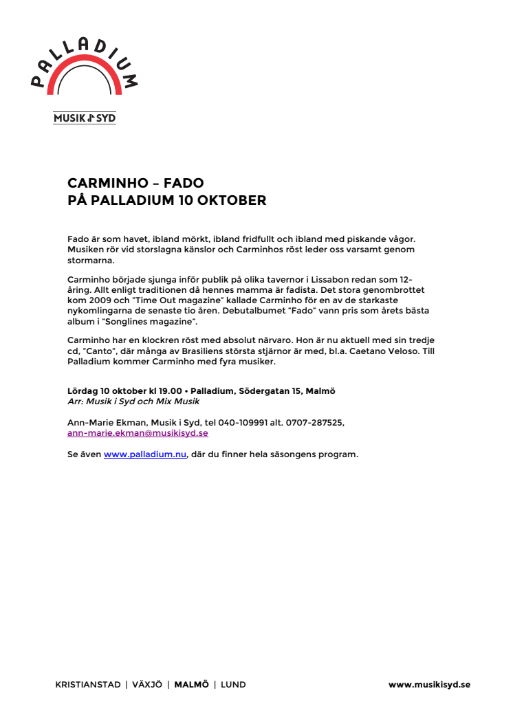 Carminho sjunger fado med en klockren röst och absolut närvaro. Hon är nu aktuell med sin tredje cd, ”Canto”, där många av Brasiliens största stjärnor är med, bl.a. Caetano Veloso. Till Palladium kommer Carminho den 10 oktober kl 19 med fyra musiker.