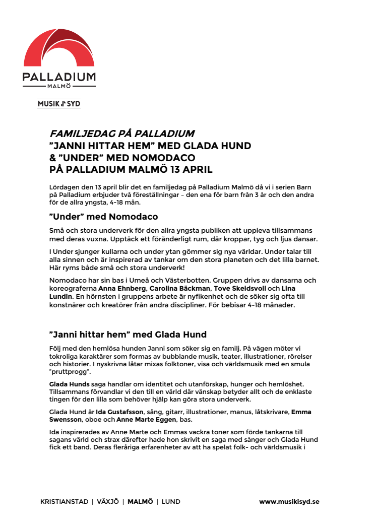 Lördagen den 13 april blir det en familjedag på Palladium Malmö. I serien Barn på Palladium erbjuder vi två föreställningar – den ena för barn från 3 år, "Janni hittar hem" med Glada Hund, och den andra för de allra yngsta, 4-18 mån, "Under" med Nomodaco.