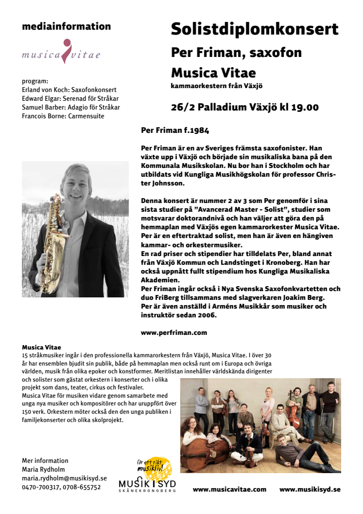 Snart får den svenska musikvärlden en nybakad diplomsolist när Växjögrabben Per Friman tar sin solistexamen som saxofonist på Kungliga Musikskolan. Nu ska han visa upp sin fingerfärdighet och musikalitet och väljer att konsertera på hemmaplan. Tillsammans med Växjös egen kammarorkester Musicas Vitae framförs examenskonserten på Palladium fredag 26/2 lö 19.00 på Palladium i Växjö.