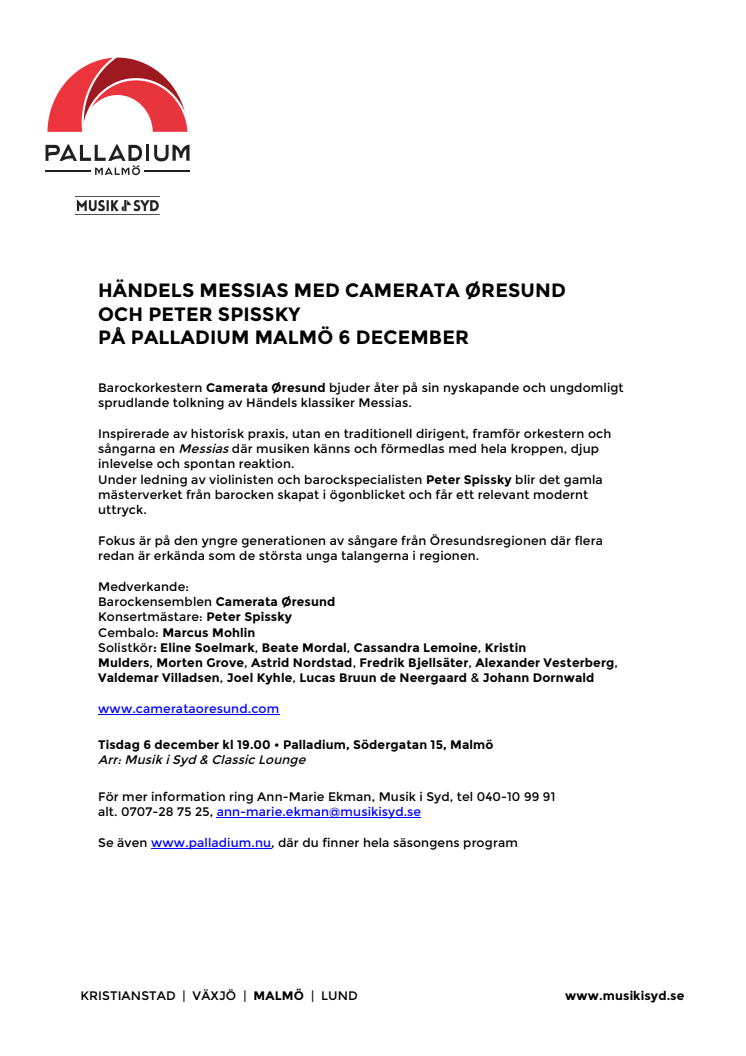 Händels Messias med Camerata Øresund och Peter Spissky på Palladium Malmö 6 december