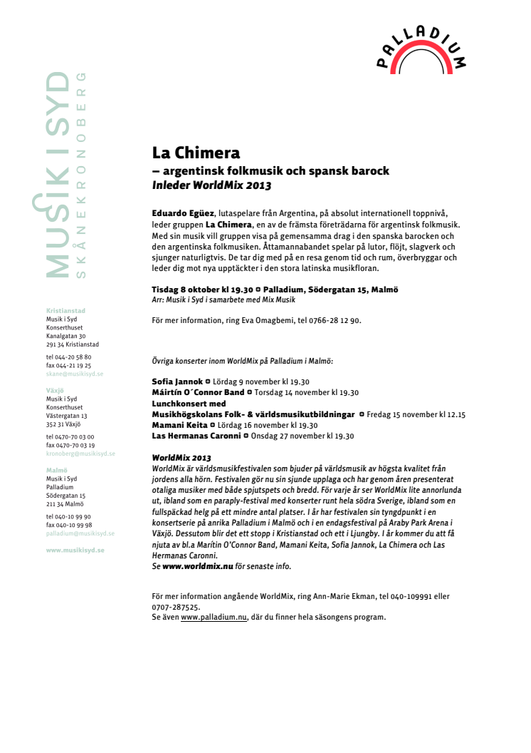 La Chimera inleder WorldMix 8 okt på Palladium i Malmö