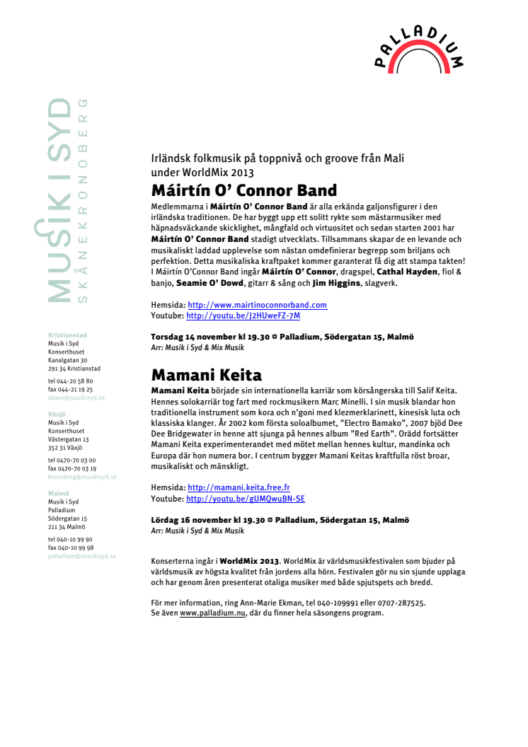 Irländsk folkmusik på toppnivå och groove från Mali under WorldMix 2013. Máirtin O'Connor Band gästar Palladium i Malmö den 14 november. Tillsammans skapar de en levande och musikaliskt laddad upplevelse som nästan omdefinierar begrepp som briljans och perfektion. Den 16 november spelar Mamani Keita på samma scen. Hennes kraftfulla röst bygger broar, musikaliskt och mänskligt.