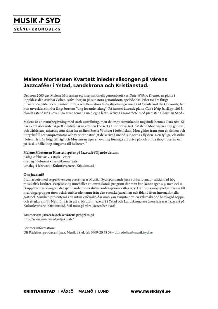 Malene Mortensen Kvartett är först ut när Jazzcafé har premiär för vårens program. Musiken presenteras i en intim cafémiljö där man kan avnjuta t.ex. en välsmakande hemlagad soppa och ett glas vin/öl. Nytt för i år är att vi förutom Jazzcafé i Ystad och Landskrona, nu även lanserar Jazzcafé på Kulturkvarteret Kristianstad.