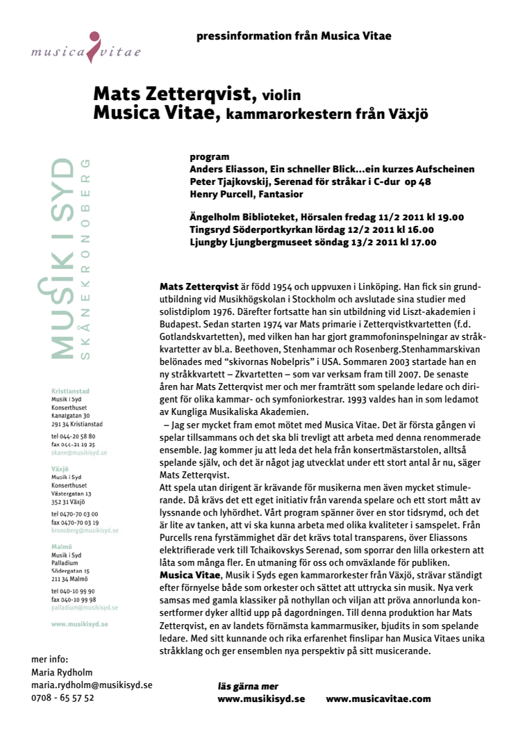 - En utmaning för oss och omväxlande för publiken! Så beskriver violinisten och kammarmusikern Mats Zetterqvist konserten som han tillsammans med Musica Vitae turnerar med till helgen. Musik från barockens Henry Purcell till Anders Eliassons nutida elektrifierade verk. Ängelholm Biblioteket fredag 11/2 kl 19.00, Tingsryd Söderportkyrkan lördag 12/2 kl 16.00, Ljungby Ljungbergmuseet kl 17.00