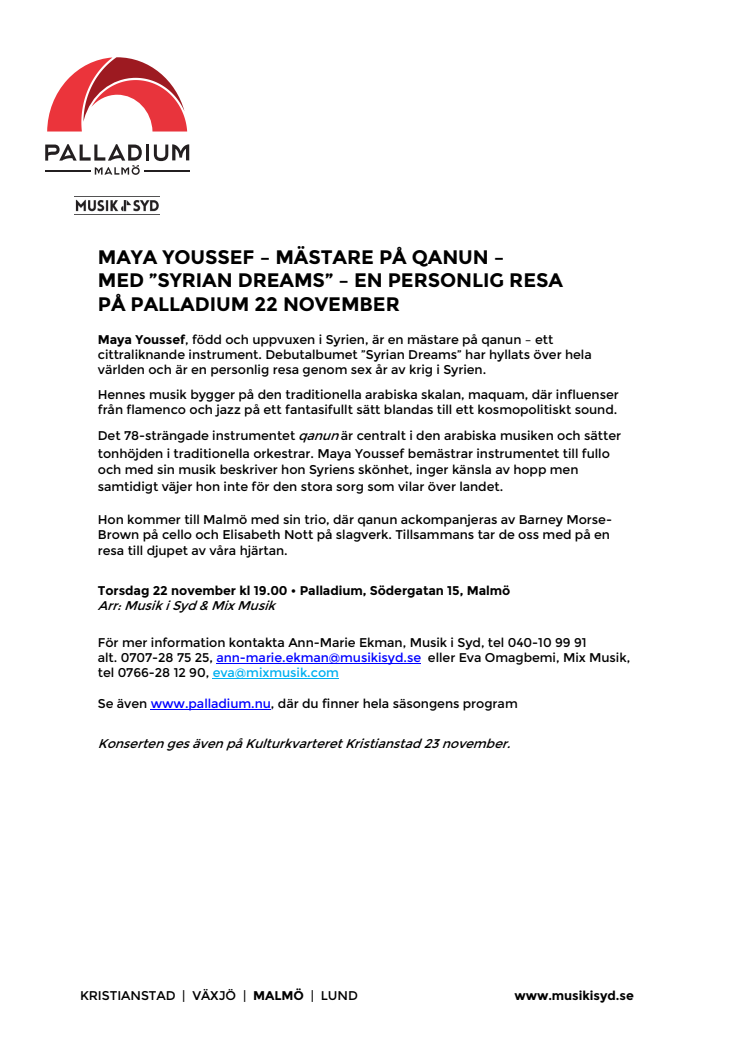 Maya Youssef, född och uppvuxen i Syrien, är en mästare på qanun – ett cittraliknande instrument. Debutalbumet ”Syrian Dreams” har hyllats över hela världen och är en personlig resa genom sex år av krig i Syrien. Nu kommer hon till Palladium Malmö 22 november med sin trio för att ta oss med på en resa till djupet av våra hjärtan.
