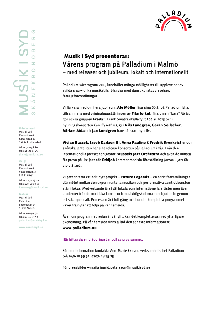 Palladium vårprogram 2015 innehåller många möjligheter till upplevelser av skilda slag – olika musikstilar blandas med dans, konstupplevelser, familjeföreställningar.
