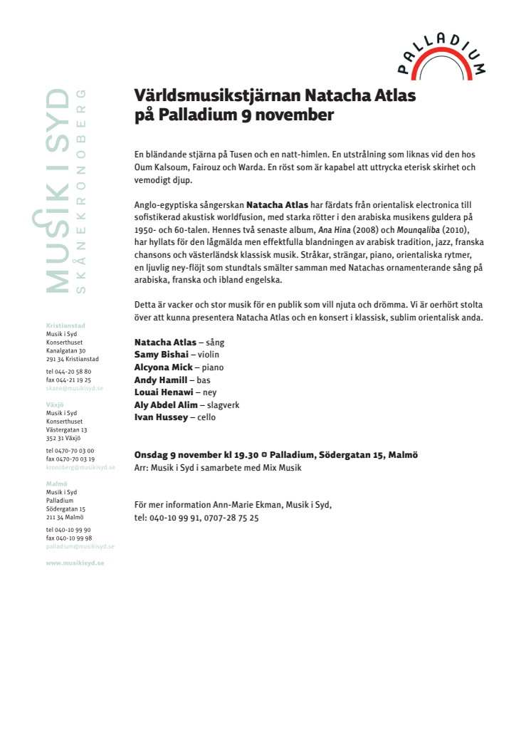 Anglo-egyptiska sångerskan Natacha Atlas har beskrivits som sofistikerad akustisk worldfusion, Nu kommer hon till Palladium i Malmö för en konsert den 9 november kl 19.30