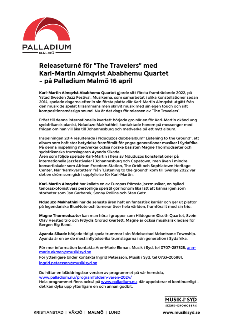 Karl-Martin Almqvist Ababhemu Quartet är på releaseturné med albumet ”The Travelers” och kommer till Palladium Malmö 16 april. Kvartetten består av Karl-Martin Almqvist, tenorsaxofon, Nduduzo Makhathini, piano, Magne Thormodsæter, bas och Ayanda Sikade, trummor.