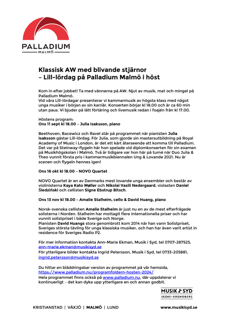 AW på Palladoium Malmö – höstens program presenterar Julia Isaksson, piano, (11 sept), NOVO Quartet (16 okt )och Amalie Stalheim,cello och David Huang, piano (13 nov). Njut av musik, mat och mingel, konserten börjar kl 18.00 och är ca 60 min utan paus. Vi bjuder på lätt förtäring och livemusik redan i foajén från kl 17.00.