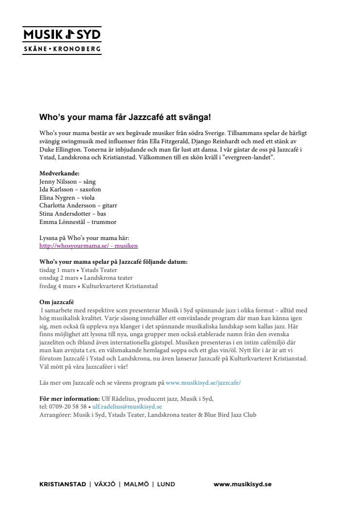 Who’s your mama består av sex begåvade musiker från södra Sverige. Tillsammans spelar de härligt svängig swingmusik med influenser från Ella Fitzgerald, Django Reinhardt och med ett stänk av Duke Ellington. Tonerna är inbjudande och man får lust att dansa. I vår gästar de oss på Jazzcafé i Ystad, Landskrona och Kristianstad. Välkommen till en skön kväll i ”evergreen-landet”.