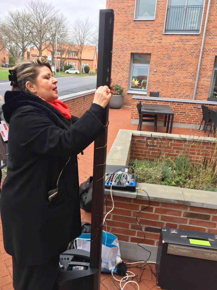 44 konserter i julsångsturné på äldreboenden med Musik i Syd i december. Sanja Streuli pyntar inför sin och P-O Nilssons korta julkonsert utanför ett äldreboende i Trelleborg.