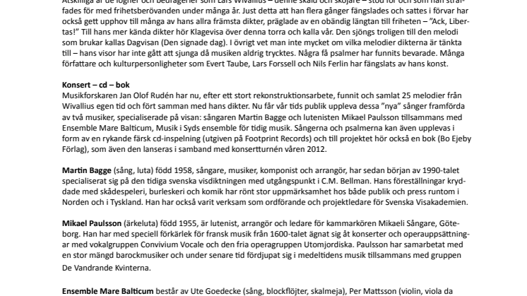 Den svenske 1600-talsdiktaren Lars Wivallius (1605-1669) är lika känd för sin viskonst som ökänd för sitt skandalomsusade liv. I konsertföreställningen Ack, Libertas! framförs tidigare okänt material av Wivallius – en av de största svenska kulturpersonligheterna på sin tid. Medverkar gör Ensemble Mare Balticum med musikerna Martin Bagge – som har gjort sig känd som en stiltrogen 1700-talsinterpret med C.M. Bellman som specialitet – och Mikael Paulsson. Åtskilliga är de lögner och bedrägerier som Lars Wivallius – denne skald och skojare – stod för och som han straffades för med frihetsberövanden under många år. Just detta att han flera gånger fängslades och sattes i förvar har också gett upphov till många av hans allra främsta dikter, präglade av en obändig längtan till friheten – ”Ack, Libertas!” Till hans mer kända dikter hör Klagevisa över denna torra och kalla vår. Den sjöngs troligen till den melodi som brukar kallas Dagvisan (Den signade dag). I övrigt vet man inte mycket om vilka melodier dikterna är tänkta till – hans visor har inte gått att sjunga då musiken aldrig trycktes. Några få psalmer har funnits bevarade. Många författare och kulturpersonligheter som Evert Taube, Lars Forssell och Nils Ferlin har fängslats av hans konst.