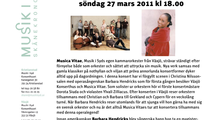 Musica Vitae, Musik i Syds egen kammarorkester från Växjö, strävar ständigt efter förnyelse både som orkester och sättet att uttrycka sin musik. Nya verk samsas med gamla klassiker på nothyllan och viljan att pröva annorlunda konsertformer dyker alltid upp på dagordningen. I denna konsert har vi förgyllt scenen i Christina Nilsson-salen med operasångerskan Barbara Hendricks som för första gången besöker Växjö Konserthus och Musica Vitae. Som solister ur orkestern hör vi förste konsertmästare Dorota Siuda och violasten Ylvali Zilliacus. Efter konserten i Växjö reser orkestern tillsammans med Christian och Barbara till Grekland och Cypern för en veckolång turné. När Barbara Hendricks reser utomlands för att sjunga vill hon gärna ha med sig en svensk orkester och nu är det alltså Musica Vitaes tur att konsertera tillsammans med denna operalegend!