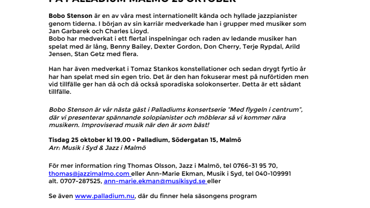 För mer information ring Thomas Olsson, Jazz i Malmö, tel 0766-31 95 70, thomas@jazzimalmo.com eller Ann-Marie Ekman, Musik i Syd, tel 040-109991