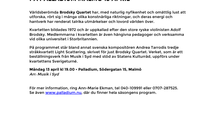 På programmet står bland annat svenska kompositören Andrea Tarrodis tredje stråkkvartett Light Scattering, skrivet för just Brodsky Quartet. Verket, som är ett beställningsverk från Musik i Syd med stöd av Statens Kulturråd, uppförs under kvartettens Sverigeturné.
