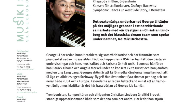 Det sextonåriga underbarnet George Li tänjer på det möjligas gränser i ett nervkittlande samarbete med världsstjärnan Christian Lindberg och det klassiska dream team som spelar under namnet, Re:Mix Orchestra. Musik i Syds egen kammarorkester Musica Vitae och Stockholms Läns Blåsarsymfoniker är för detta tillfället den unika orkestern som ger den klassiska musiken en ny färg och klang.