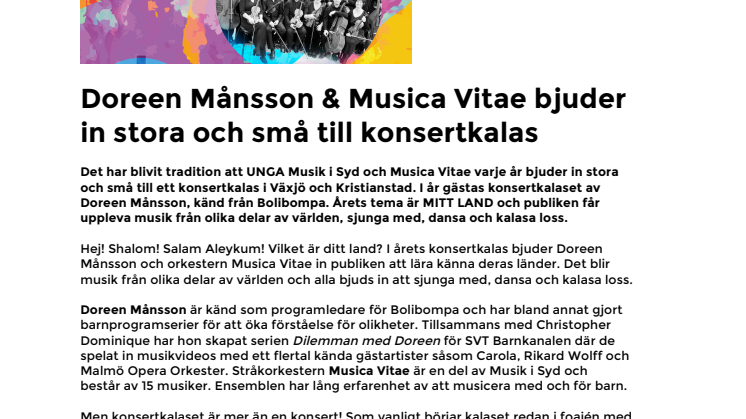Det har blivit tradition att UNGA Musik i Syd och Musica Vitae varje år bjuder in stora och små till ett konsertkalas i Växjö och Kristianstad. I år gästas konsertkalaset av Doreen Månsson, känd från Bolibompa. Årets tema är MITT LAND och publiken får uppleva musik från olika delar av världen, sjunga med, dansa och kalasa loss.