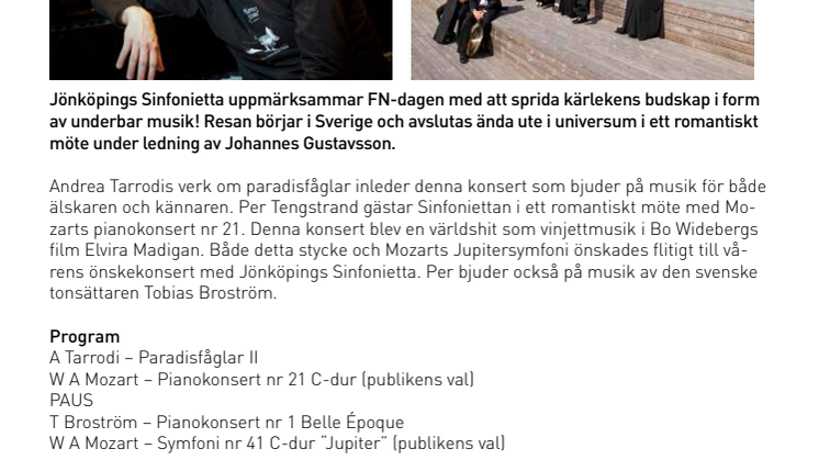 Andrea Tarrodis verk om paradisfåglar inleder denna konsert som bjuder på musik för både älskaren och kännaren. Per Tengstrand gästar Sinfoniettan i ett romantiskt möte med Mozarts pianokonsert nr 21. Denna konsert blev en världshit som vinjettmusik i Bo Widebergs film Elvira Madigan. Både detta stycke och Mozarts Jupitersymfoni önskades flitigt till vårens önskekonsert med Jönköpings Sinfonietta. Per bjuder också på musik av den svenske tonsättaren Tobias Broström.