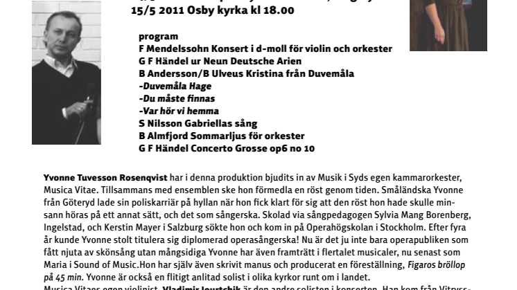 Yvonne Tuvesson Rosenqvist har i denna produktion bjudits in av Musik i Syds egen kammarorkester, Musica Vitae. Tillsammans med ensemblen ske hon förmedla en röst genom tiden. Småländska Yvonne från Göteryd lade sin poliskarriär på hyllan när hon fick klart för sig att den röst hon hade skulle minsann höras på ett annat sätt, och det som sångerska. Skolad via sångpedagogen Sylvia Mang Borenberg, Ingelstad, och Kerstin Mayer i Salzburg sökte hon och kom in på Operahögskolan i Stockholm. Efter fyra år kunde Yvonne stolt titulera sig diplomerad operasångerska! Nu är det ju inte bara operapubliken som fått njuta av skönsång utan mångsidiga Yvonne har även framträtt i flertalet musicaler, nu senast som Maria i Sound of Music.Hon har själv även skrivit manus och producerat en föreställning, Figaros bröllop på 45 min. Yvonne är också en flitigt anlitad solist i olika kyrkor runt om i landet.