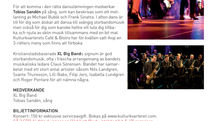 För att komma i den rätta dansstämningen medverkar Tobias Sandén på sång, som kan beskrivas som ett mellanting av Michael Bublé och Frank Sinatra. I afton dans är till för dig som älskar att dansa till svängig storbandsmusik men också för dig som kanske hellre vill luta dig tillbaka och njuta av skön musik tillsammans med en bit mat. Kulturkvarterets Café & Bistro har för kvällen satt ihop en 3-rätters meny som finns att förboka.