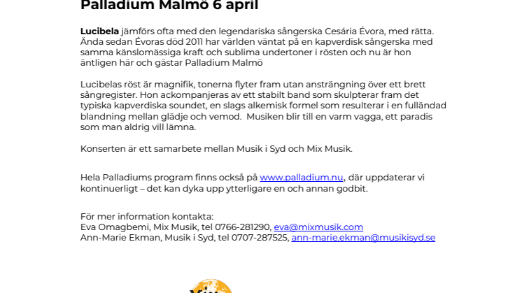 Lucibela jämförs ofta med den legendariska sångerska Cesária Évora, med rätta. Ända sedan Évoras död 2011 har världen väntat på en kapverdisk sångerska med samma känslomässiga kraft och sublima undertoner i rösten och nu är hon äntligen här och gästar Palladium Malmö