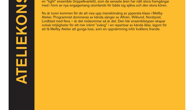 Nu är turen kommen för de att visa upp manskörsång av yppersta klass i Mellby Atelier. Programmet domineras av kända sånger av Alfvén, Wiklund, Nordqvist, Lindblad med flera – är det midsommar så är det. Den här ensembletypen skapar också möjligheter för ett mer intimt ”sväng” i en repertoar av kända låtar, lagom för att få Mellby Atelier att gunga loss, som en uppvärmning inför kvällens firande.