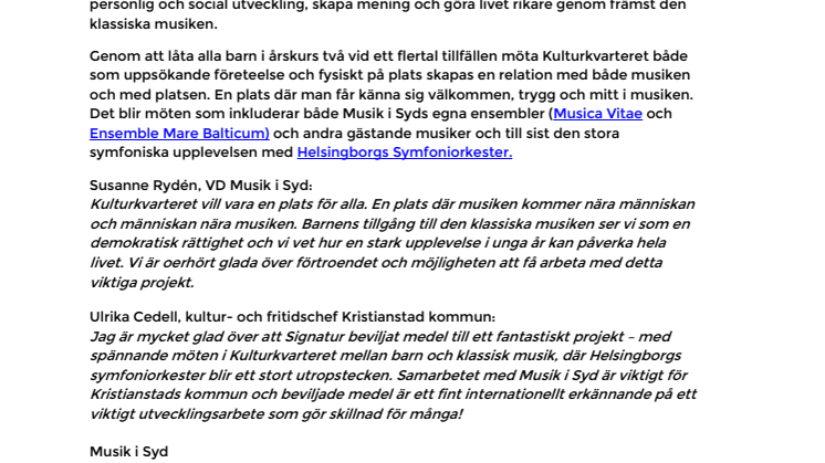 Jag är mycket glad över att Signatur beviljat medel till ett fantastiskt projekt – med spännande möten i Kulturkvarteret mellan barn och klassisk musik, där Helsingborgs symfoniorkester blir ett stort utropstecken. Samarbetet med Musik i Syd är viktigt för Kristianstads kommun och beviljade medel är ett fint internationellt erkännande på ett viktigt utvecklingsarbete som gör skillnad för många!