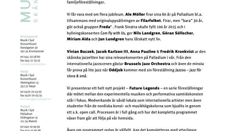 Vivian Buczek, Jacob Karlzon III, Anna Pauline & Fredrik Kronkvist ur den skånska jazzeliten har sina releasekonserten på Palladium i vår. Från den internationella jazzscenen gästar Brussels Jazz Orchestra och även de minsta får prova på lite jazz när Oddjob kommer med sin föreställning Jazzoo – jazz för stora & små.