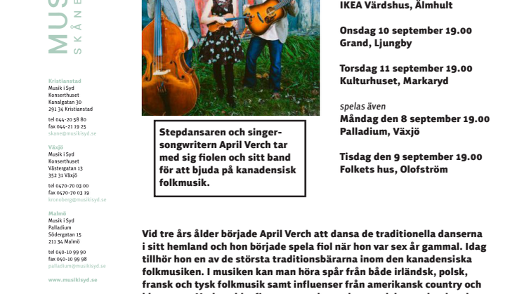Vid tre års ålder började April Verch att dansa de traditionella danserna i sitt hemland och hon började spela fiol när hon var sex år gammal. Idag tillhör hon en av de största traditionsbärarna inom den kanadensiska folkmusiken. I musiken kan man höra spår från både irländsk, polsk, fransk och tysk folkmusik samt influenser från amerikansk country och bluegrass. Med snabba fingrar, stepdans, charm och humor har bandet blivit hyllade i både Nordamerika, Europa och Australien. April Verch Band består av April Verch, Hayes Griffin och Cody Walters.Onsdag 3 september kl 19.00, Fröseke Folkets Hus