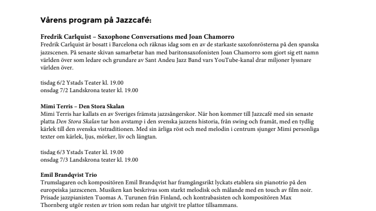 Populära Jazzcafé i Ystad och Landskrona fortsätter under våren med finstämd, spännande jazz på högsta nivå. Som vanligt presenteras musiken i en intim cafémiljö där besökarna under konserten kan avnjuta en välsmakande, hemlagad soppa med ett glas vin/öl till.