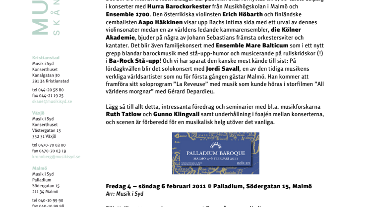 Under första helgen i februari presenterar Musik i Syd än en gång södra Sveriges största barockfestival med konserter, workshops, seminarier och Master Class. Mellan 4 – 6 februari 2011 bjuder Palladium Baroque för sjätte året i rad in världsartister, barockensembler samt unga och lovande musiker till Malmö för en upplevelserik musikhelg. Temat för i år är Johann Sebastian Bach – musik av en av barockens verkliga giganter.