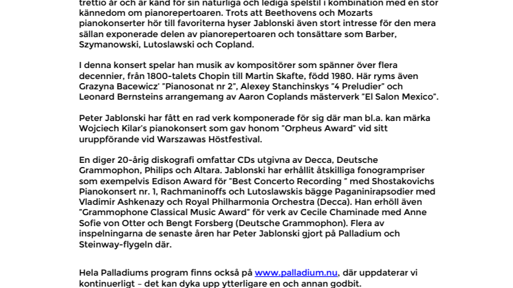 Peter Jablonski har varit verksam på de stora internationella scenerna i drygt trettio år och är känd för sin naturliga och lediga spelstil i kombination med en stor kännedom om pianorepertoaren. Trots att Beethovens och Mozarts pianokonserter hör till favoriterna hyser Jablonski även stort intresse för den mera sällan exponerade delen av pianorepertoaren och tonsättare som Barber, Szymanowski, Lutoslawski och Copland.