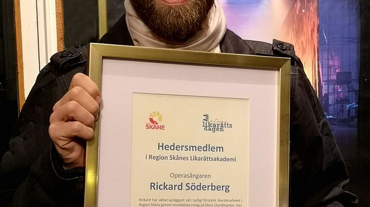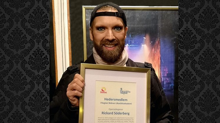 Operasångaren Rickard Söderberg som nyligen medverkade i Stora Likarättsgalan har utsetts till den första hedersmedlemmen i Region Skånes Likarättsakademi.
