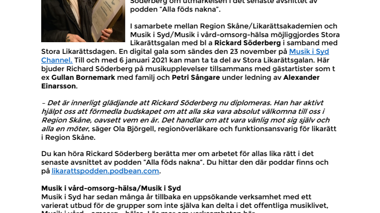 I samarbete mellan Region Skåne/Likarättsakademien och Musik i Syd/Musik i vård-omsorg-hälsa möjliggjordes Stora Likarättsgalan med bl a Rickard Söderberg i samband med Stora Likarättsdagen. En digital gala som sändes den 23 november på Musik i Syd Channel. Till och med 6 januari 2021 kan man ta ta del av Stora Likarättsgalan. Här bjuder Richard Söderberg på musikupplevelser tillsammans med gästartister som t ex Gullan Bornemark med familj och Petri Sångare under ledning av Alexander Einarsson.