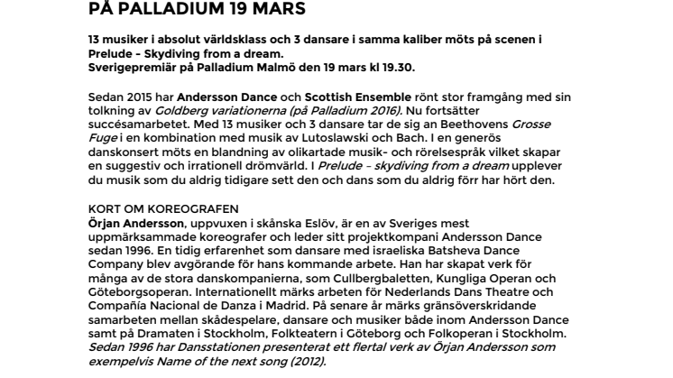 Sedan 2015 har Andersson Dance och Scottish Ensemble rönt stor framgång med sin tolkning av Goldberg variationerna (på Palladium 2016). Nu fortsätter succésamarbetet. Med 13 musiker och 3 dansare tar de sig an Beethovens Grosse Fuge i en kombination med musik av Lutoslawski och Bach. I en generös danskonsert möts en blandning av olikartade musik- och rörelsespråk vilket skapar en suggestiv och irrationell drömvärld. I Prelude – skydiving from a dream upplever du musik som du aldrig tidigare sett den och dans som du aldrig förr har hört den.