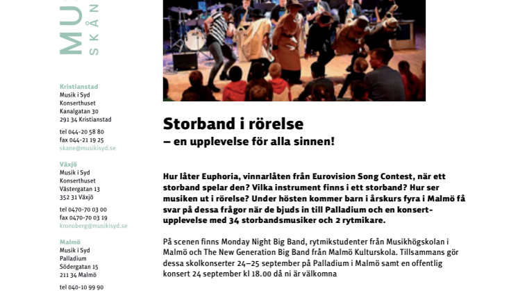 Hur låter Euphoria, vinnarlåten från Eurovision Song Contest, när ett storband spelar den? Vilka instrument finns i ett storband? Hur ser musiken ut i rörelse? Under hösten kommer barn i årskurs fyra i Malmö få svar på dessa frågor när de bjuds in till Palladium och en konsertupplevelse med 34 storbandsmusiker och 2 rytmikare.