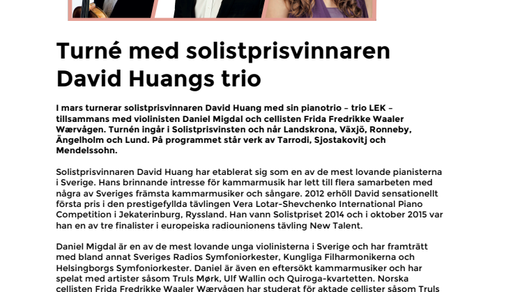 I mars turnerar solistprisvinnaren David Huang med sin pianotrio – trio LEK – tillsammans med violinisten Daniel Migdal och cellisten Frida Fredrikke Waaler Wærvågen. Turnén ingår i Solistprisvinsten och når Landskrona, Växjö, Ronneby, Ängelholm och Lund. På programmet står verk av Tarrodi, Sjostakovitj och Mendelssohn.
