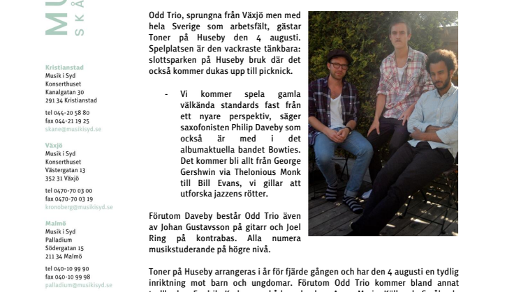 Odd Trio, sprungna från Växjö men med hela Sverige som arbetsfält, gästar Toner på Huseby den 4 augusti. Spelplatsen är den vackraste tänkbara: slottsparken på Huseby bruk där det också kommer dukas upp till picknick.