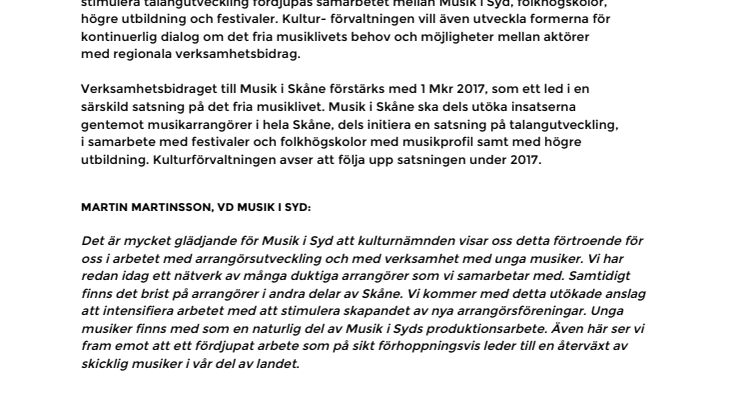 Verksamhetsbidraget till Musik i Skåne förstärks med 1 Mkr 2017, som ett led i en särskild satsning på det fria musiklivet. Musik i Skåne ska dels utöka insatserna gentemot musikarrangörer i hela Skåne, dels initiera en satsning på talangutveckling, i samarbete med festivaler och folkhögskolor med musikprofil samt med högre utbildning. Kulturförvaltningen avser att följa upp satsningen under 2017.